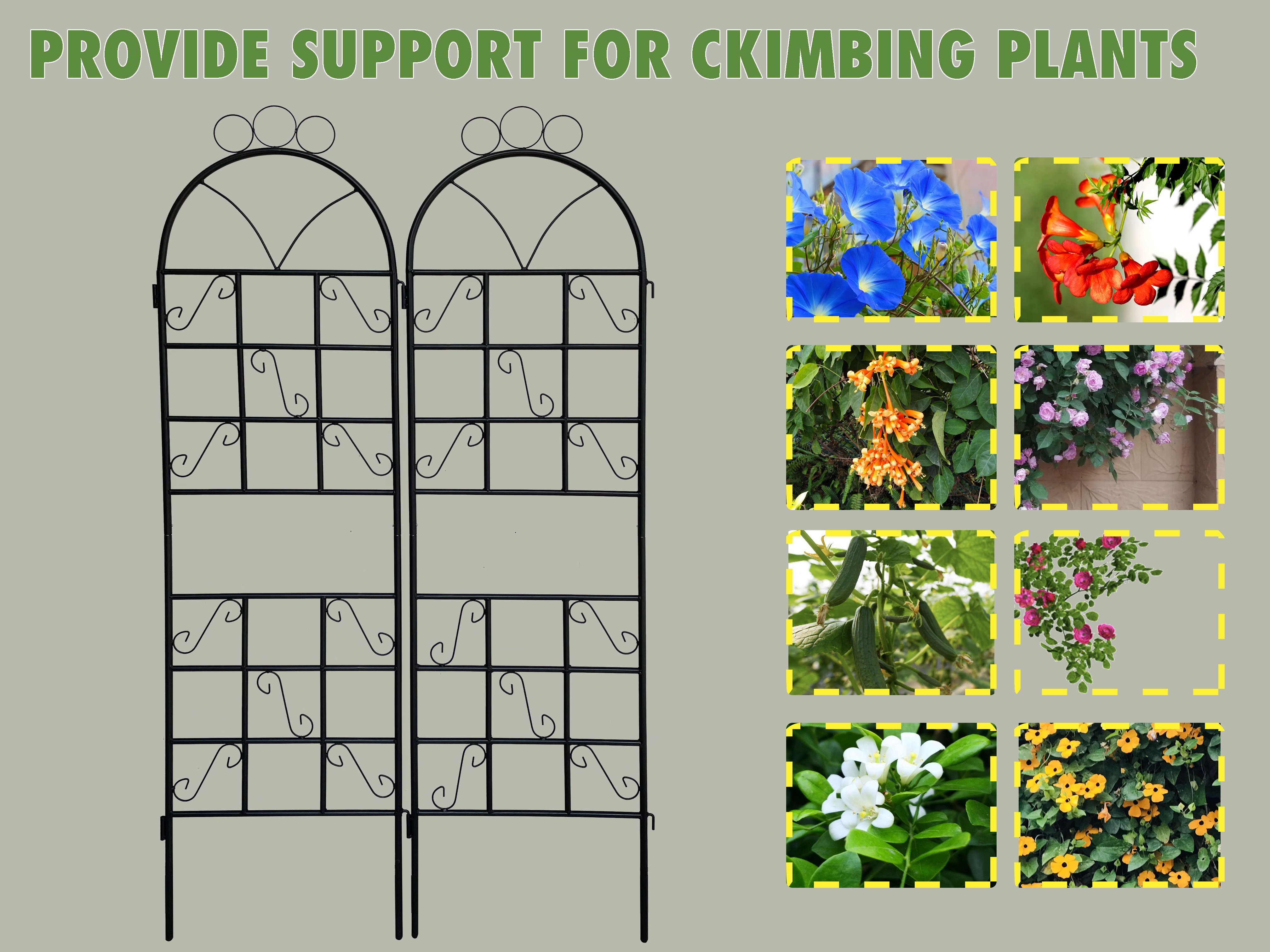 Good support for climbing plants The garden trellis is a nice choice for many kinds of climbing plants, like ivy vines, rose, morning glory, clematis, jasmine, campsis and more.
