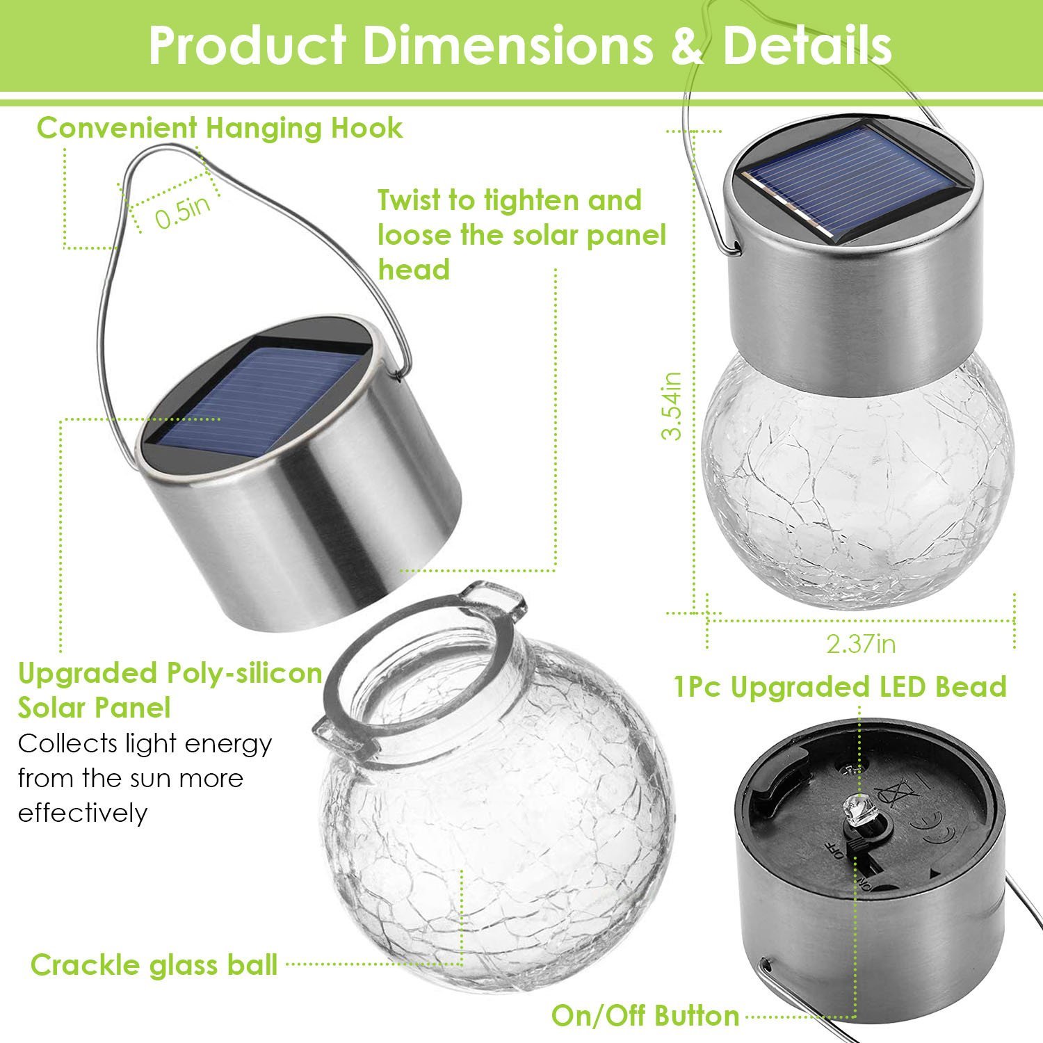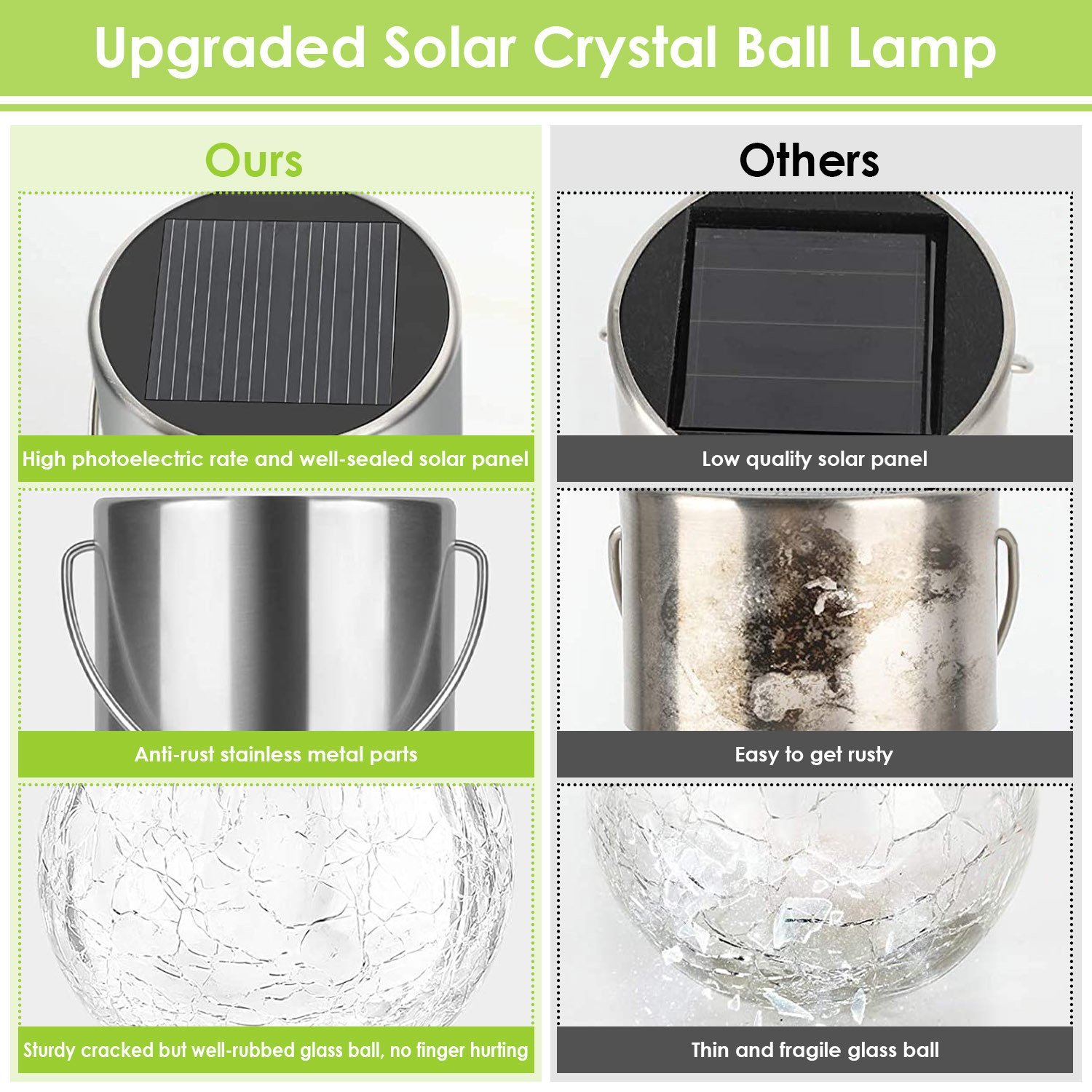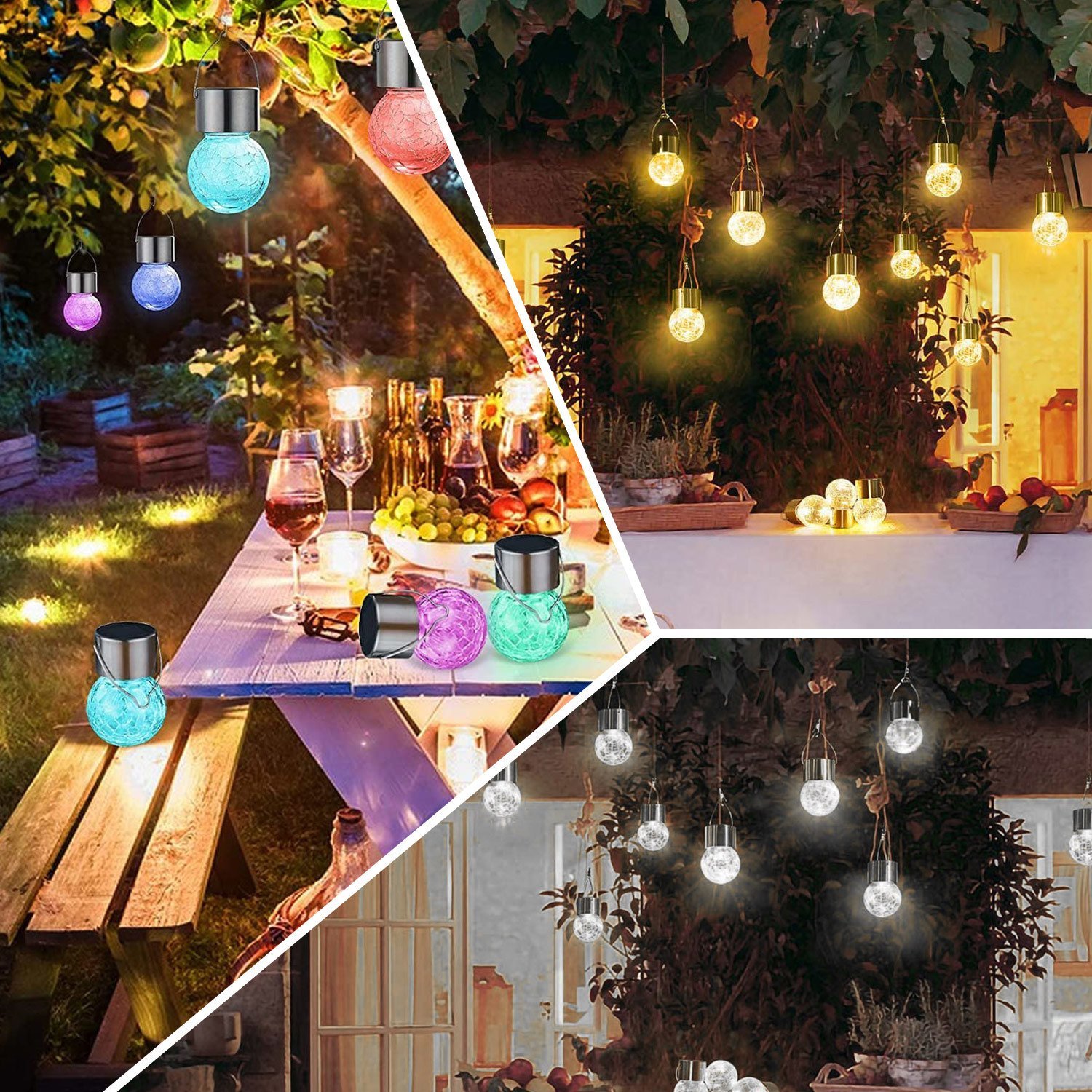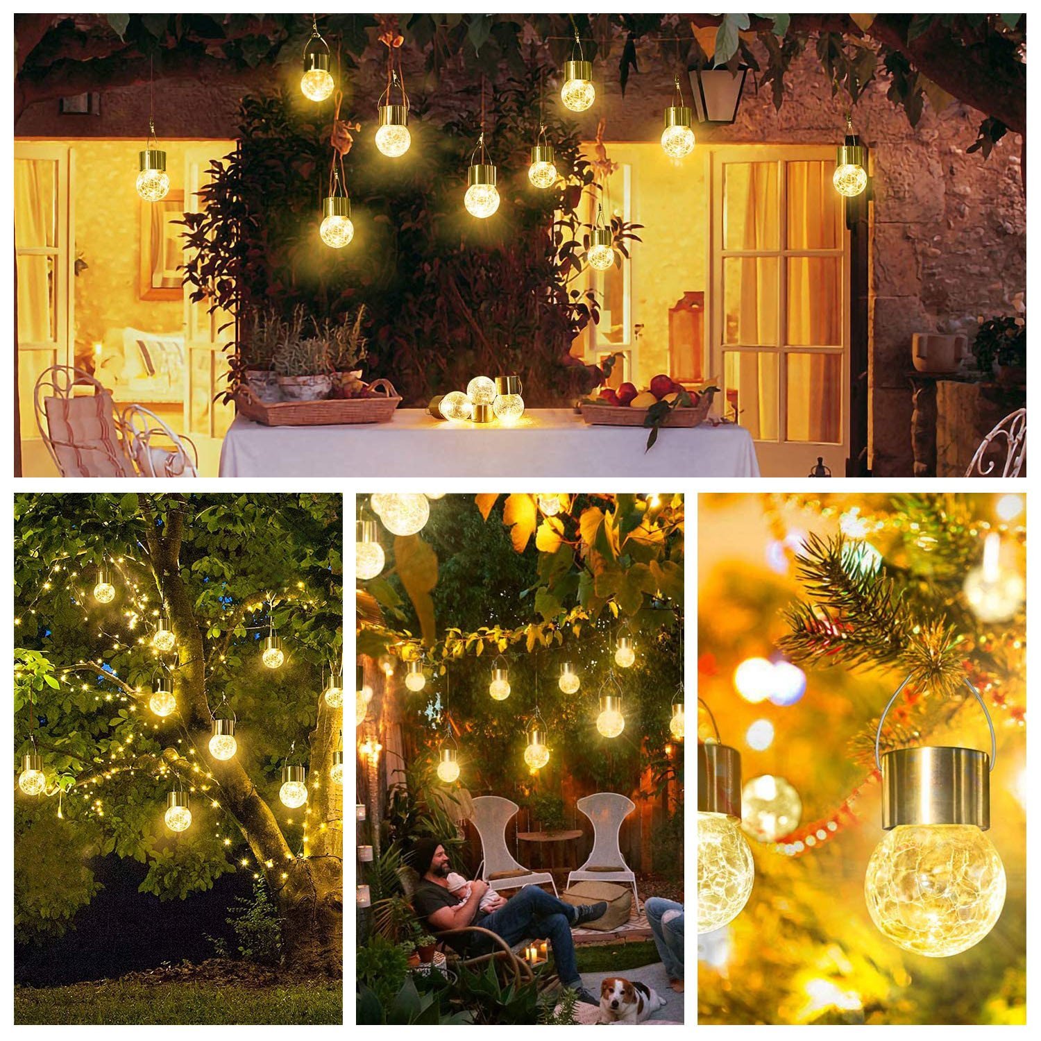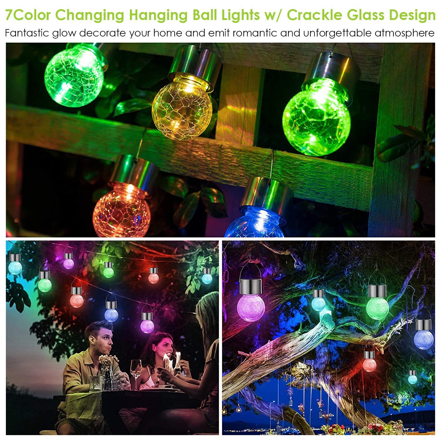**Decorative Crackle Glass Ball*:Outdoor solar hanging lights are illuminated in a variety of colors at night,in addition with an eye-catching crackled glass ball cover,emit amazing glow and delivery colorful light to your house,make your house romantic and wonderful.