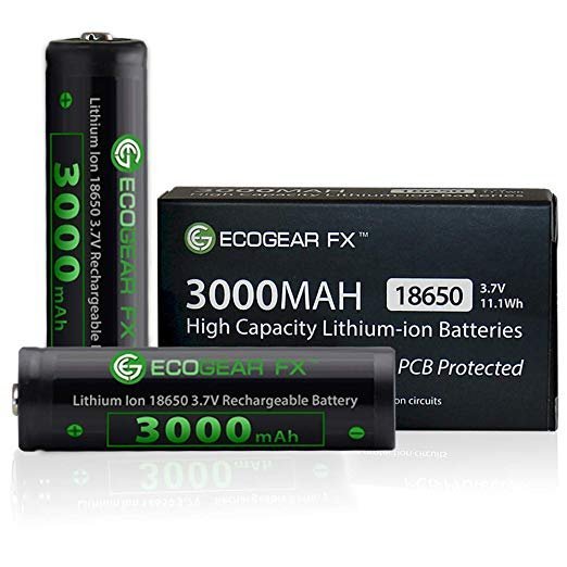 High powered 18650 lithium flashlight batteries offering 3000mAh of reliable power. The EcoGear FX 18650 button top lithium-ion rechargeable batteries are unique and are packed with an amazingly amount of powerful energy. This is our best 18650 battery as it provides dramatically increased longevity, low self-discharge, efficiency and optimized usage time. The choice battery for LED